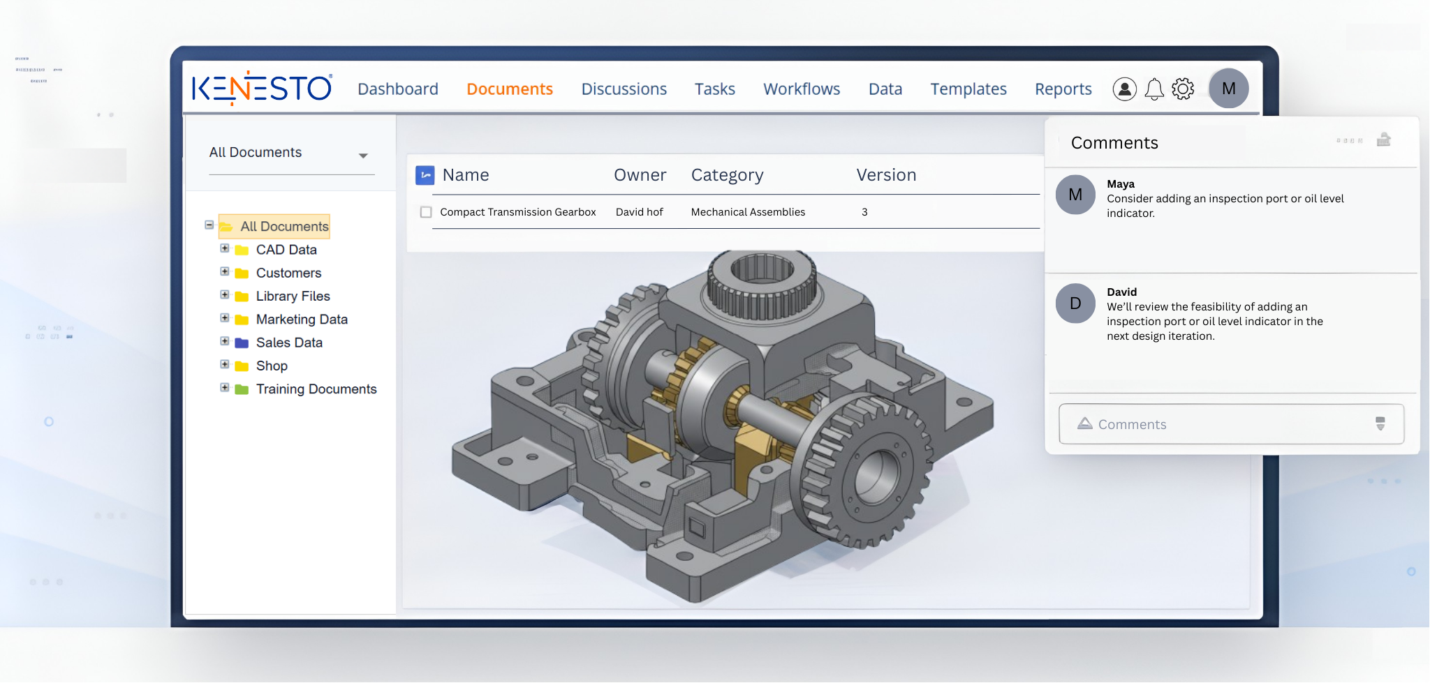 Kenesto is a cloud-based document management system that is designed by engineers for engineers and designers, delivering a robust alternative to traditional PDM solutions. With the Kenesto Drive service on a PC, CAD and other applications work directly with cloud documents just like a local drive, always ensuring access to the most current document. Kenesto provides the tools needed to share, view, collaborate with external users, manage permissions, create versions, and lock documents for day-to-day work. Kenesto provides engineers and designers functionality, simplicity, and flexibility not found in consumer cloud storage solutions such as Dropbox.